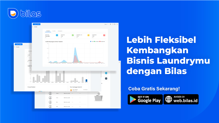 Saat baru memulai, Bilas dapat membantu mencatat order, pembayaran, dan laporan harian dengan lebih rapi. Saat order laundry mulai ramai, Bilas membantu mengelola pegawai laundry, stok bahan baku, dan operasional agar bisnis laundry tetap terkontrol.